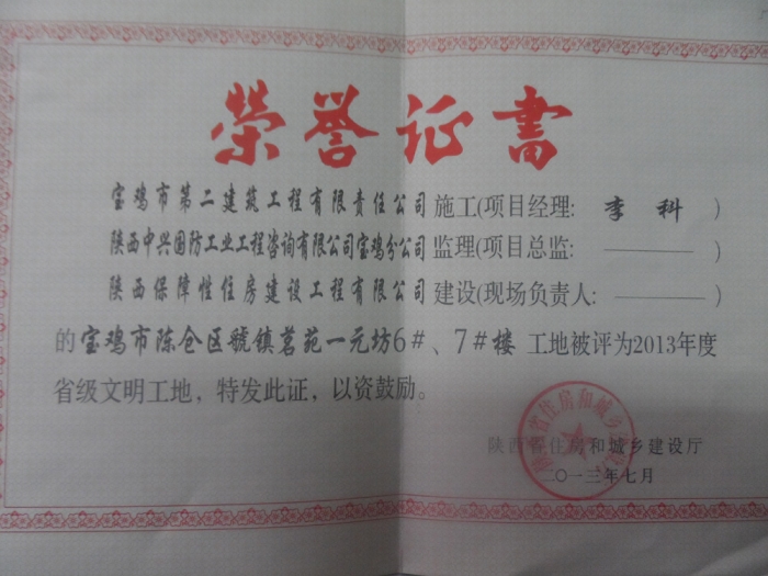 2013年省級(jí)文明工地(虢鎮(zhèn)名苑)
