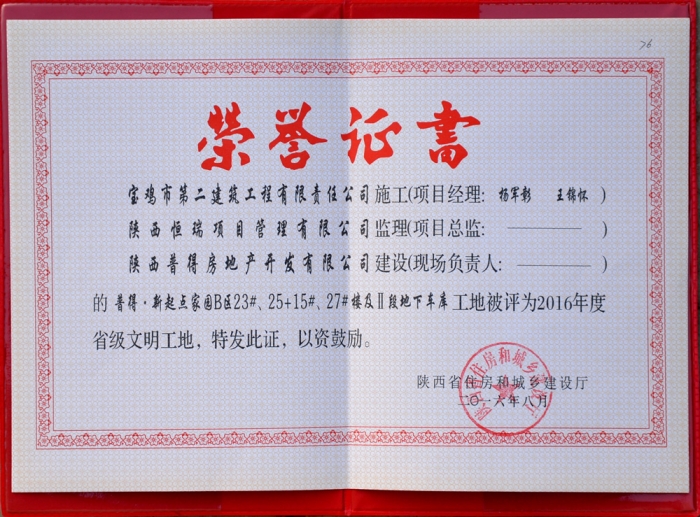 2016年省級(jí)文明工地(西藏民族學(xué)院證書(shū))