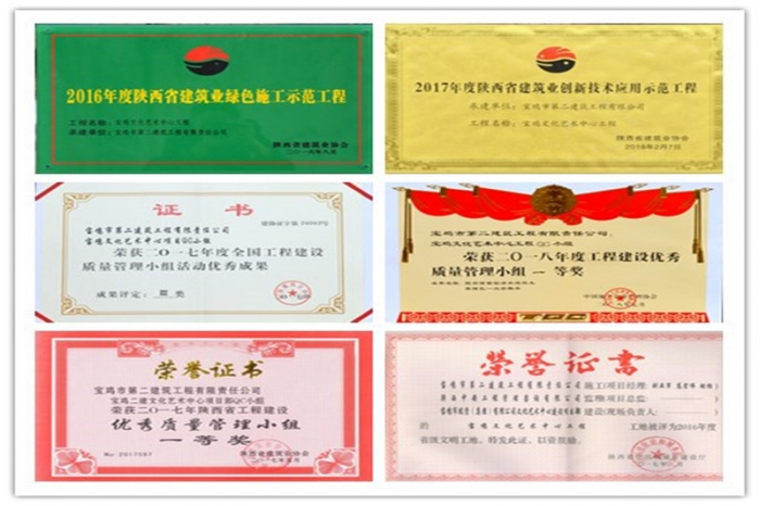艱難困苦,玉汝于成。通過項目團隊全體員工的共同努力,寶雞文化藝術(shù)中心項目先后被評為“2016年度寶雞市優(yōu)質(zhì)樣板主體工程”“2016年度陜西省建筑業(yè)綠色施工示范工程”“2016年度陜西省省級文明工地”“2017年度陜西省建筑業(yè)創(chuàng)新技術(shù)應(yīng)用示范工程”“2017年度陜西省建筑業(yè)優(yōu)質(zhì)結(jié)構(gòu)工程”;項目部先后榮獲全國工程建設(shè)質(zhì)量管理小組活動成果獎4項、陜西省工程建設(shè)優(yōu)秀QC小組成果獎7項,申報陜西省省級工法1項;項目部先后榮獲公司先進黨支部、先進單位、經(jīng)濟貢獻特別獎單位、“安康杯”安全文化知識競賽活動二等獎,規(guī)劃局系統(tǒng)先進黨支部等榮譽。