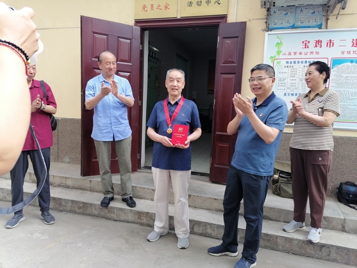 黨委副書記沈?yàn)槊駷橥诵蔹h員王體澤同志頒發(fā)“光榮在黨50年”紀(jì)念章。